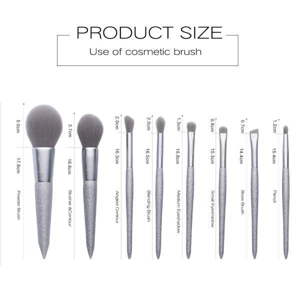 Considered the party needs,we purposely chosen 8 pieces classic face and eye brushes,these brushes can help you achieve the most party makeup needs,easy to carry and display.The "bullet" shaped brush handle symbolize the fast speed when you need urgent makeup during the party.All brushes are packed well in the Jessup exclusive one-side transparent,each brushes has its own position "Slot",the hair shape can be protected well.The whole silver color brush head,brush ferrule,brush handle blends perfectly,ensuring the users to be shinning in the party.